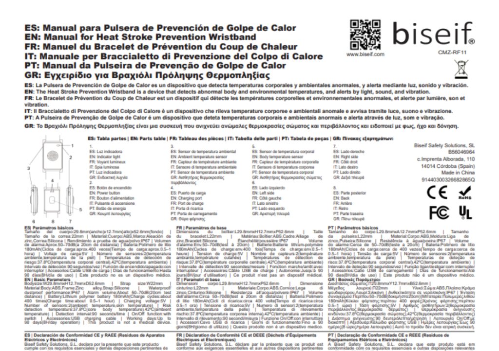 Manual de usuario de la pulsera para el golpe de calor biseif CMZ-RF11. Este manual en Español explica el funcionamiento de la pulsera.